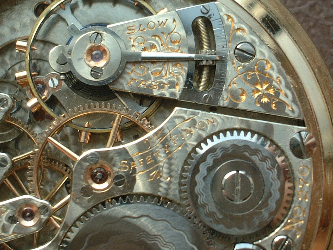 推定製造年は1904年。竜頭巻き、レバー・セット・ムーブメントで ムーブメントには、シリアル番号の他に"Elgin Nat'l Watch Co. U.S.A.", "21 Jewels", "Safety pinion", "Adjusted"と刻まれています。